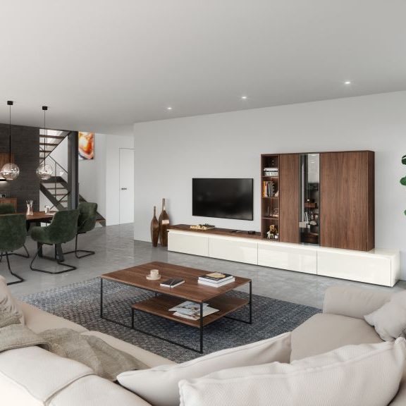 Dnevne sobe DOMLES v enakem dizajnu kot kuhinje, z velikim izborom slogov in materialov.